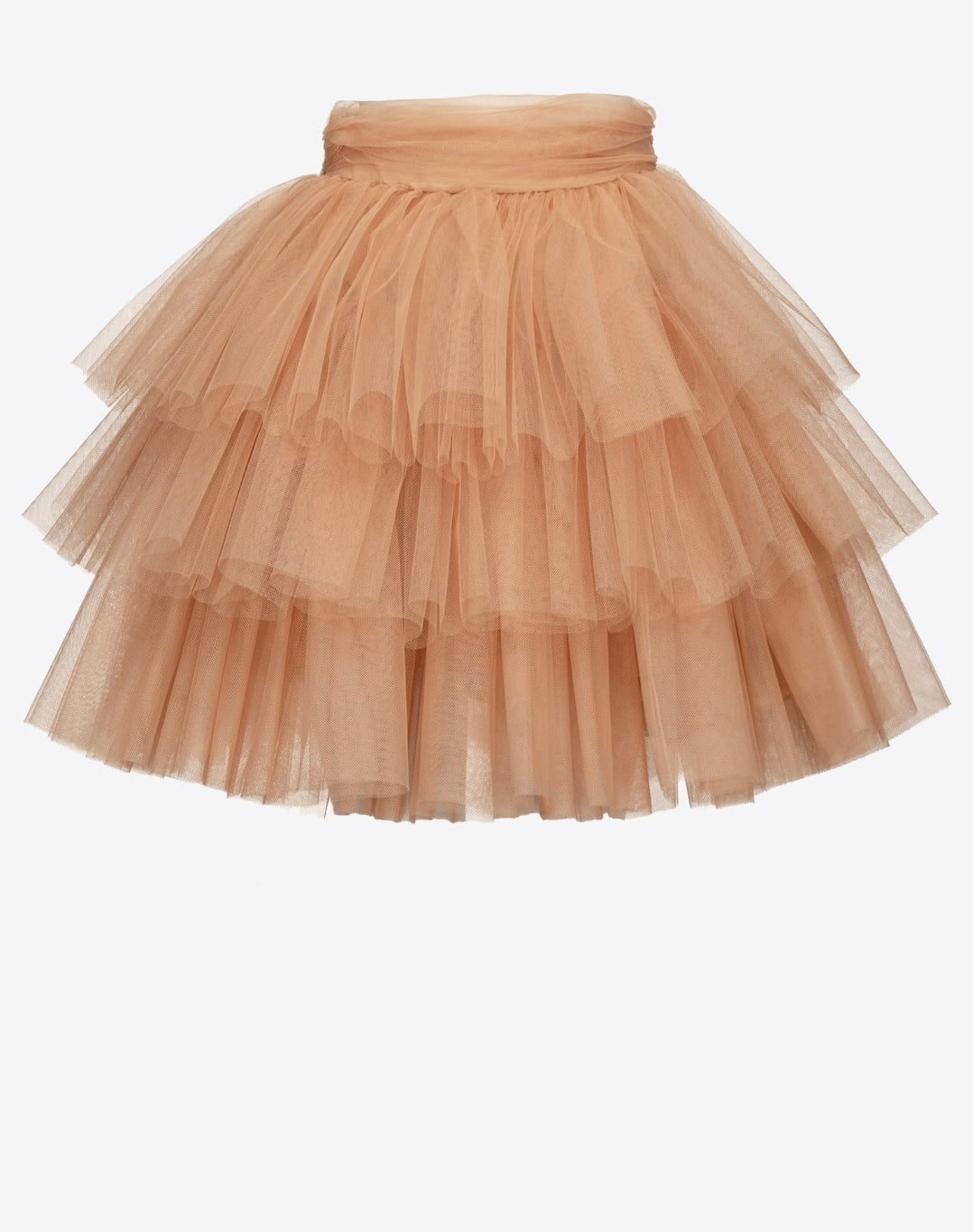 Gonna midi realizzata in tulle leggero e vaporoso con struttura a più strati. Il modello presenta vita alta e fascia in tulle arricciato che sottolinea la silhouette. La linea è ampia e svasata, per un effetto voluminoso e femminile. Chiusura laterale nascosta.
